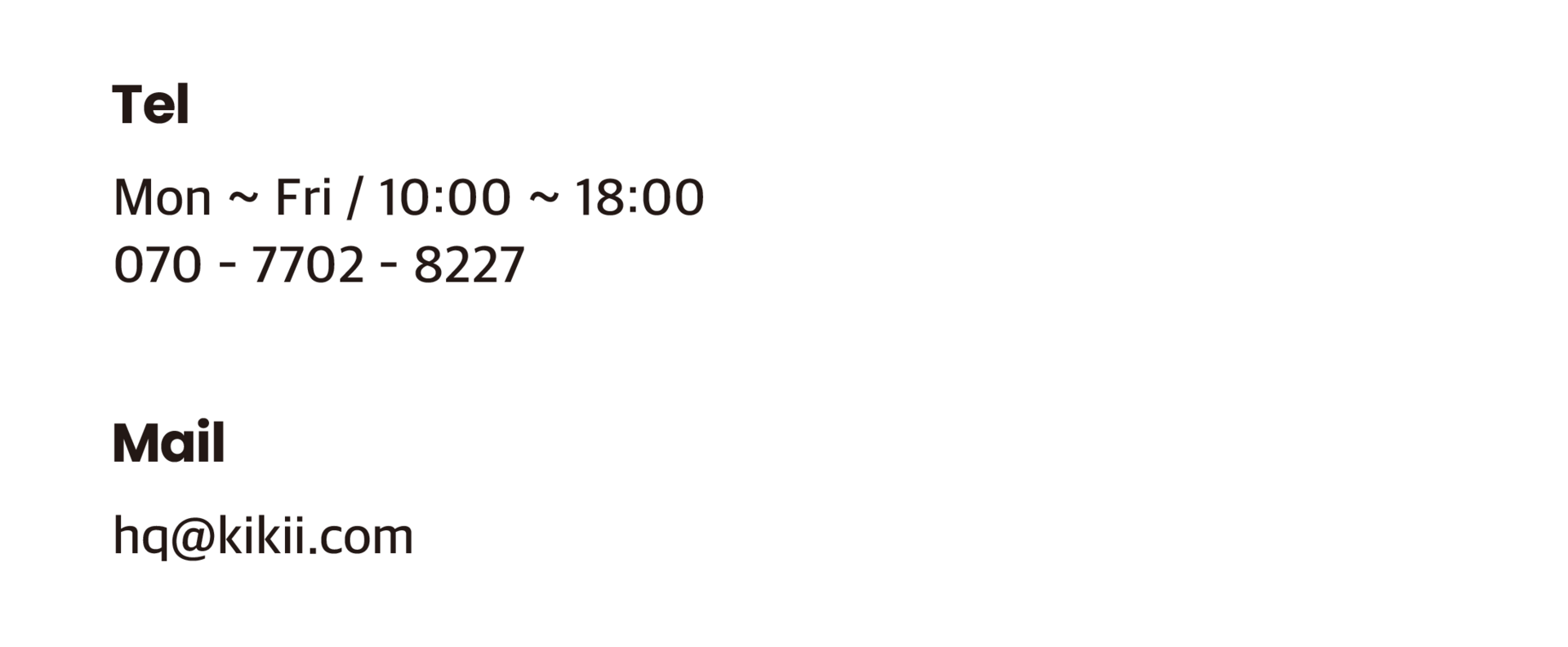 Tel. 070-7702-8227 | Fax. 0507-1799-5534 | hq@kikii.com | Addr. Seoul, Korea ㅣ Biz License 452-86-01733